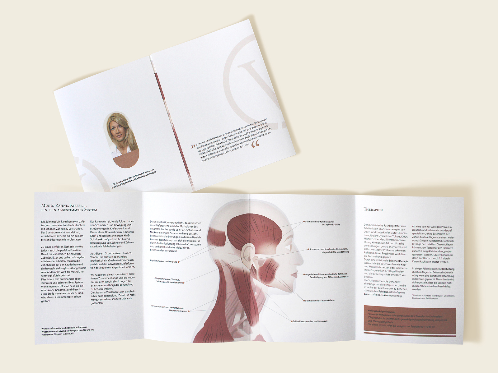 Fachbroschüre zum Thema Funktionsdiagnostik für die Zahnarztpraxis Dr. Claudia Vivell. Mit ihrer Hilfe werden Patienten über die Zusammenhänge zwischen Ästhetik und Kiefergelenkstherapie aufgeklärt.