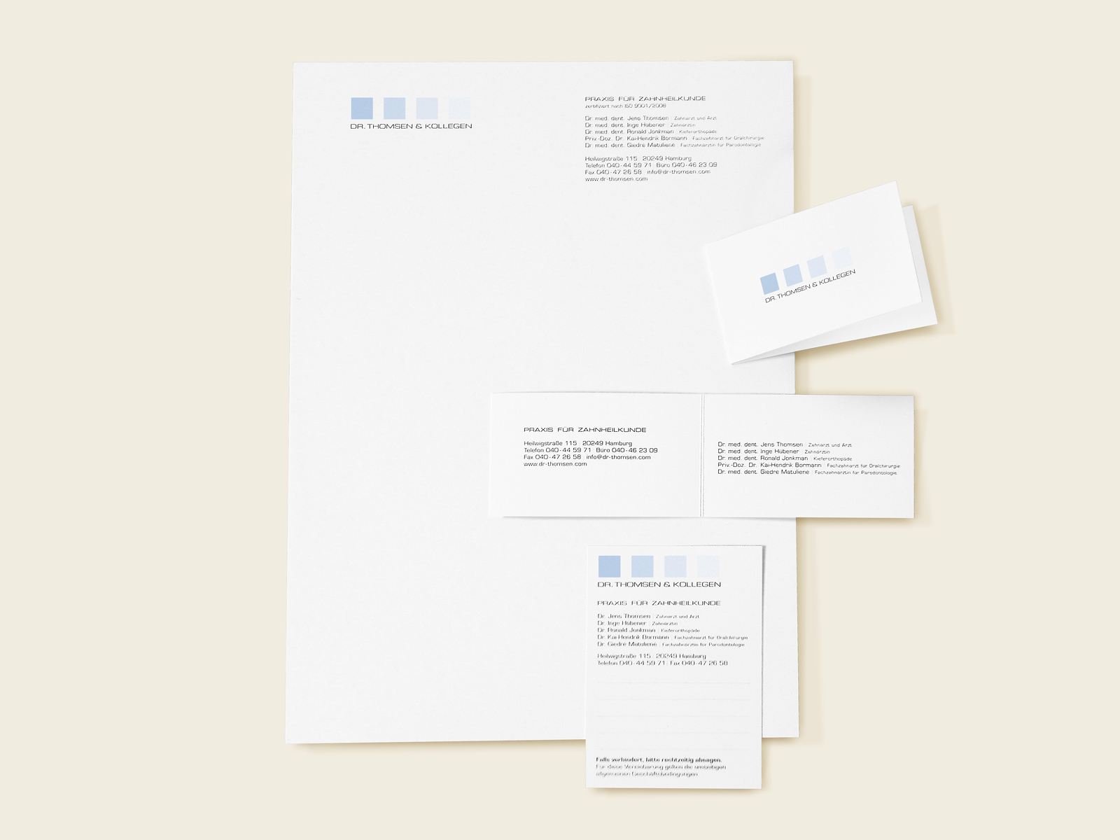 Logo Design, Briefschaft und Praxisausstattung für die Zahnarztpraxis Dr. Thomsen & Kollegen