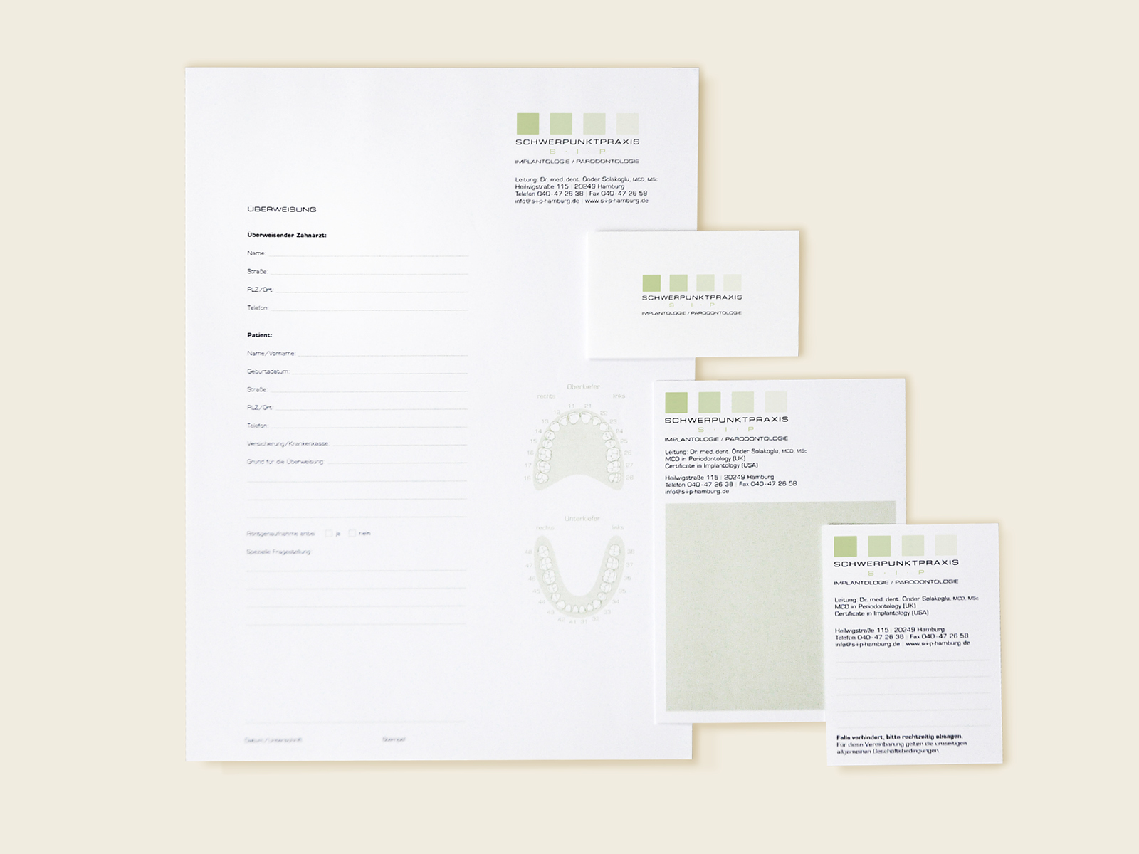 Logo Design, Briefschaft und Praxisausstattung für die Schwerpunktpraxis Implantologie und Parodontologie